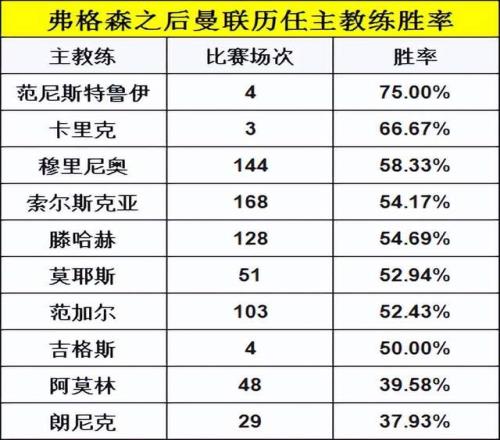 阿莫林于去年11月接替滕哈赫成为曼联主帅,至今在所有比赛中胜率仅为39.58%,仅略高于曾担任临时主帅的朗尼克。回顾后弗格森时代,无论是范加尔还是莫耶斯,虽也步履维艰,胜率仍都超过50%。即便是曾被质疑战术深度索尔斯克亚,其执教三年间的胜率也达到54.17%,略低于滕哈赫的54.69%。此外,滕哈赫任内还赢得了卡拉宝杯与足总杯两项国内锦标,为近年曼联难得的亮点。