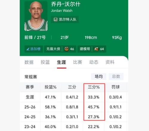 除了防守做到极致,沃尔什还用一个夏天提升了三分投射。24-25赛季他的三分命中率只有27.3%,但这一季沃尔什的三分命中率已经提升至45.7%,在出手数没有特别增加的情况下,沃尔什把命中率提升了近20个百分点,台上一分钟台下十年功,沃尔什付出多少汗水只有他自己知道。三分命中率的提升也帮助他得到更多出场机会。