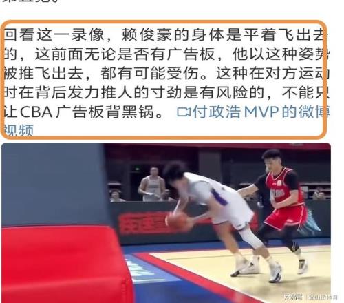 付政浩同时表示“赖俊豪抢断后已经控制住了球权,李祥波是否没必要再在他背后发力推那一下,值得商榷。职业球员在努力赢球的同时尽量注意保护一下对手。”;“赖俊豪的身体是平着飞出去的,这前面无论是否有广告板,他以这种姿势被推飞出去,都有可能受伤。这种在对方运动时在背后发力推人的寸劲是有风险的,不能只让CBA广告板背黑锅。”。