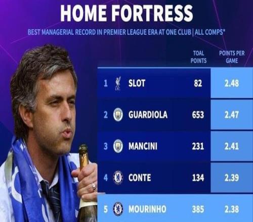 执教英超单一球队各项赛事主场场均积分榜:斯洛特2.48分居首