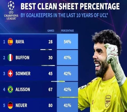 近10年欧冠门将零封率:拉亚54%第1,布冯47%第2,奥纳纳上榜